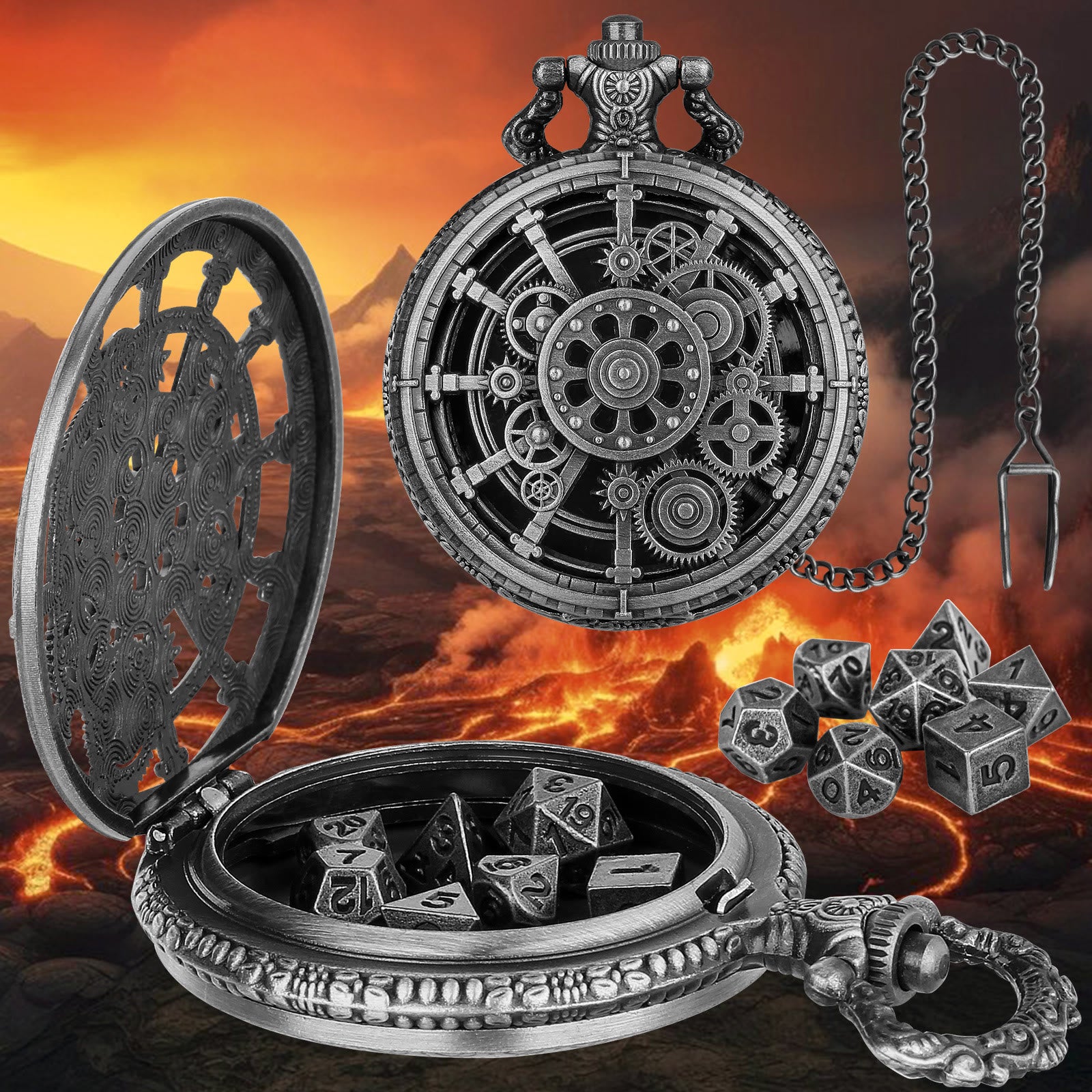 WorldNorse Steampunk Gears Würfel Set Taillenkette - Taschenuhrgehäuse + Kette + Würfel - Silber - image 1